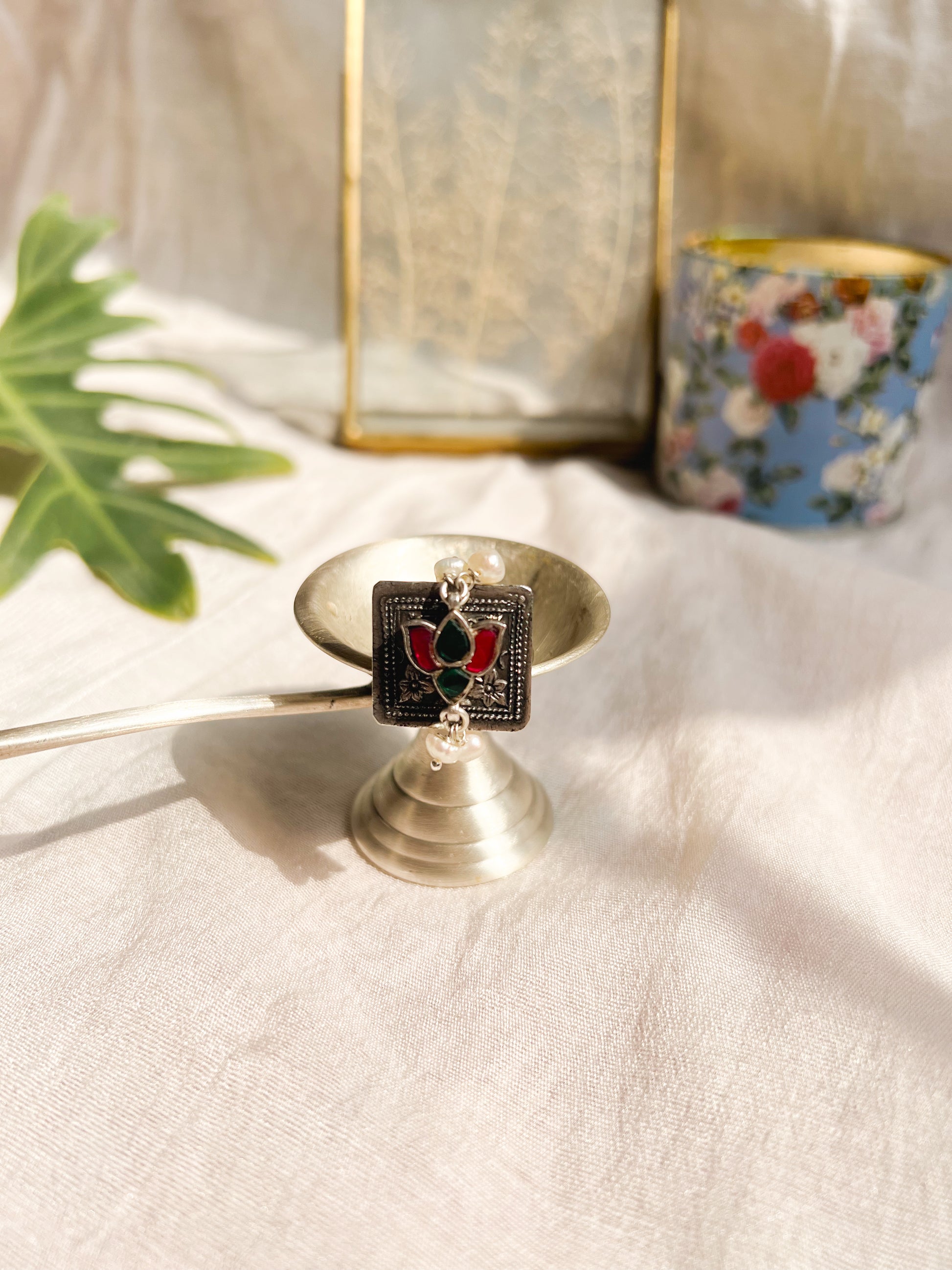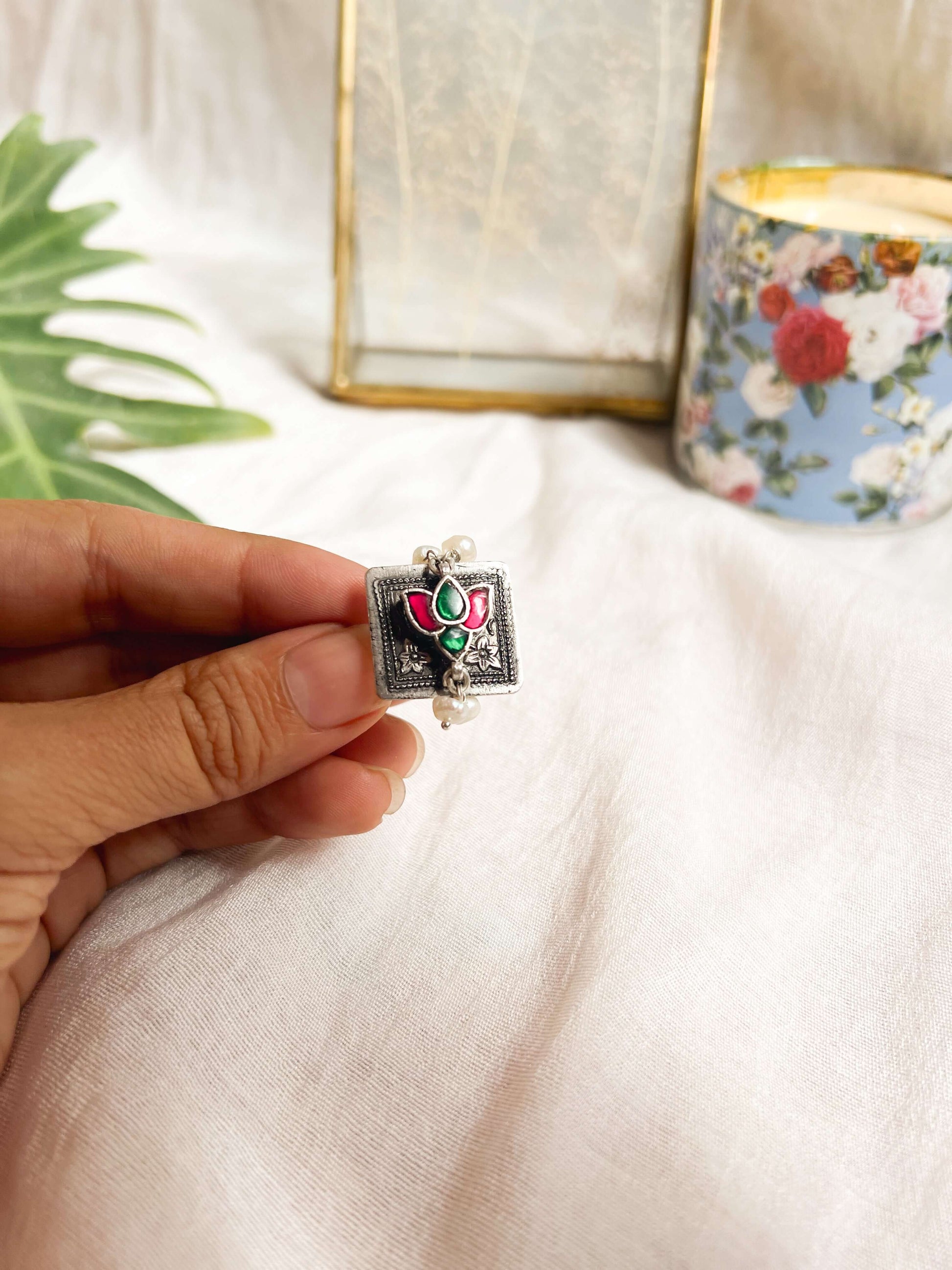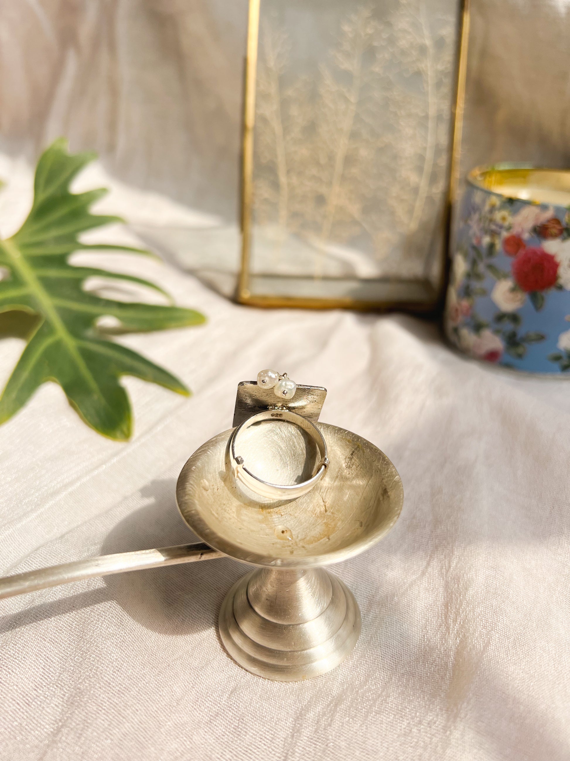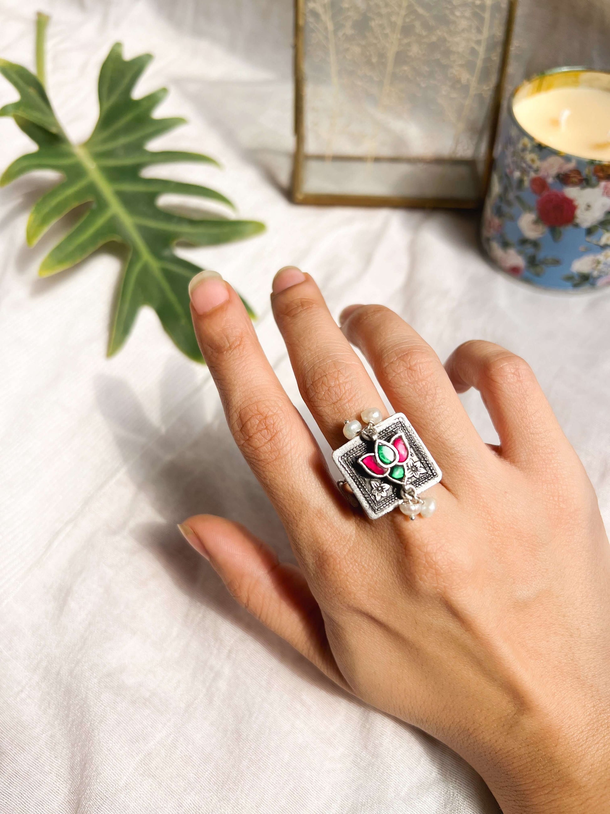 Ujjvala adjustable oxidised silver ring with pearl clusters