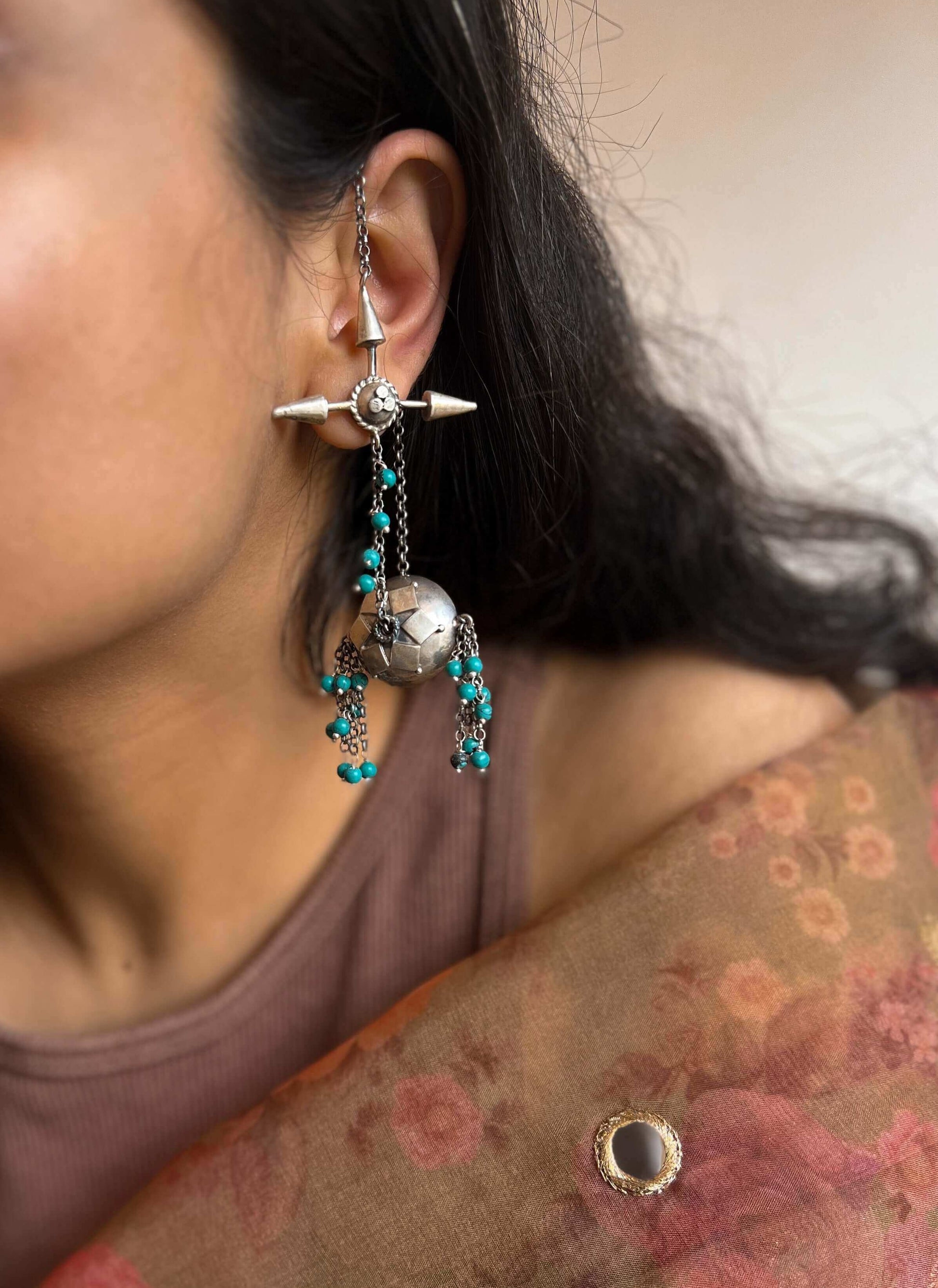 hanging chains adorned with turquoise beads, evoke a warrior spirit in its design.