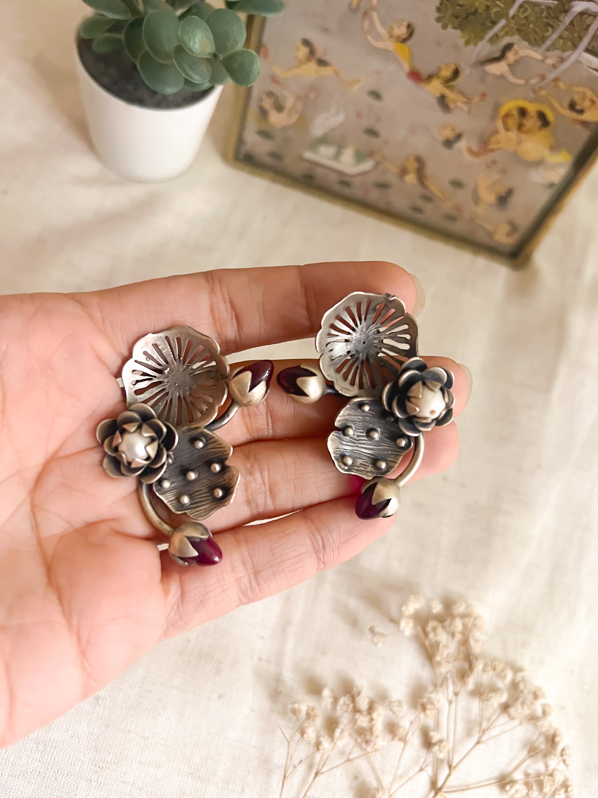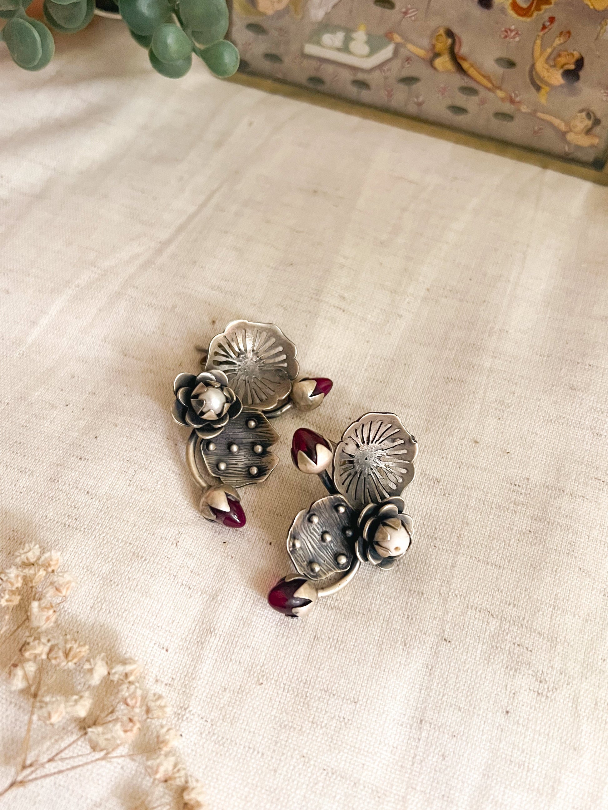 Deriving its inspiration from the lotus bud and its leaves , this piece signifies peace and tranquility. Its unique and eye catchy design , will make you the talk of the town. It has ruby stone as bud and pearl as centre of the flower