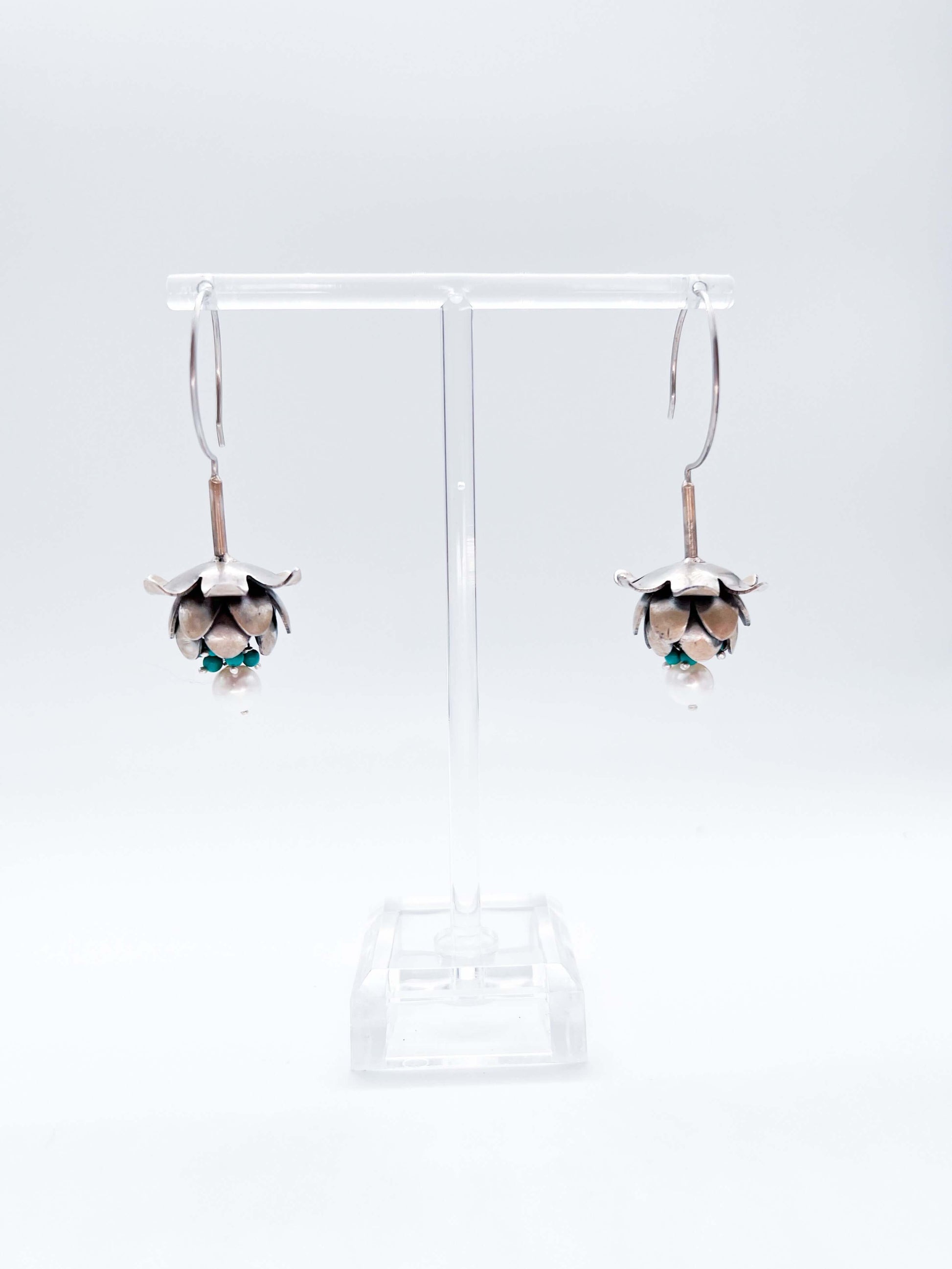 Embrace the essence of serenity and style with these hanging lotus earrings featuring a stunning cluster of turquoise beads and pearl at the heart of the design. Simple yet graceful, making these earrings versatile for both casual and formal occasions.