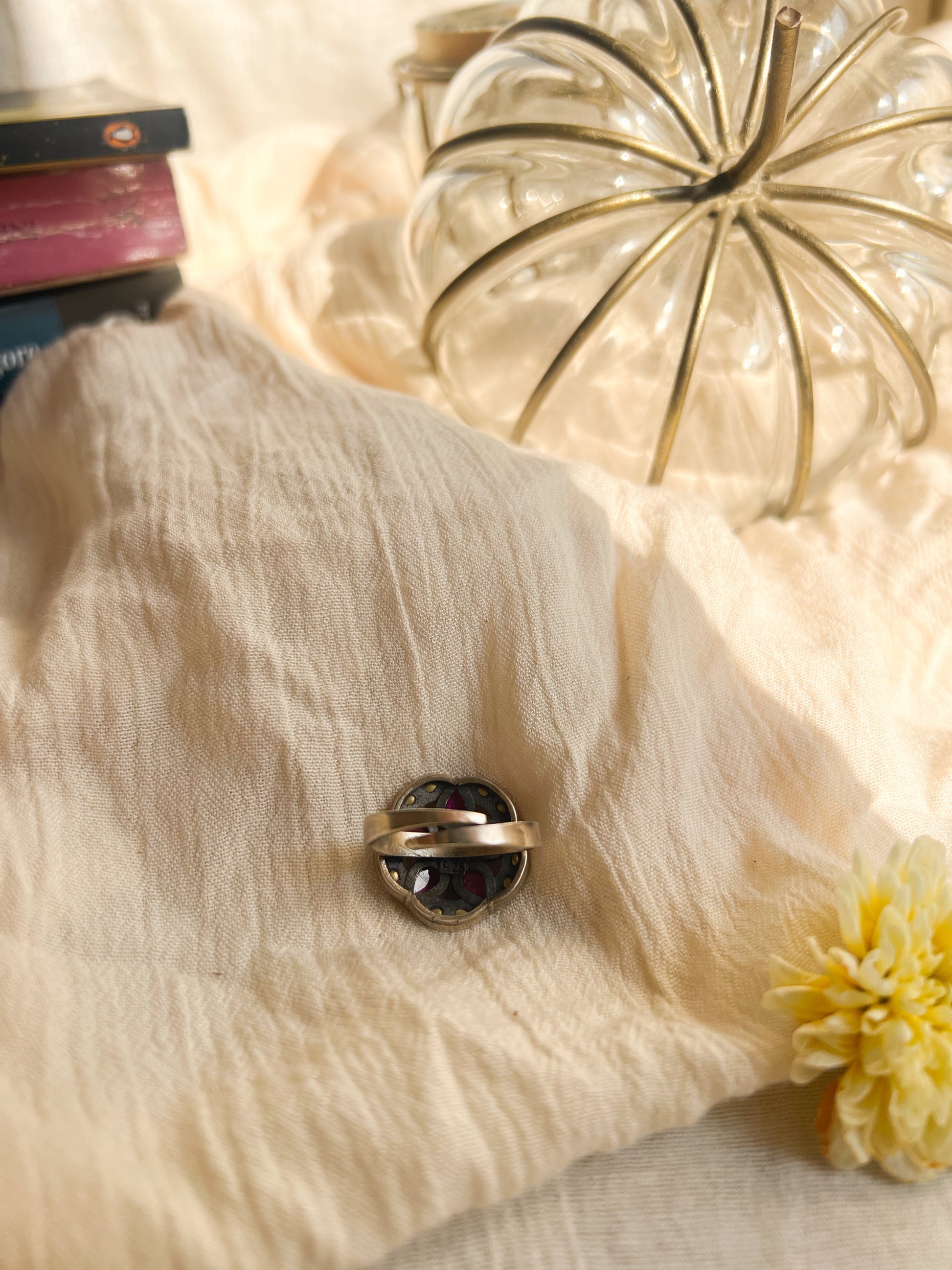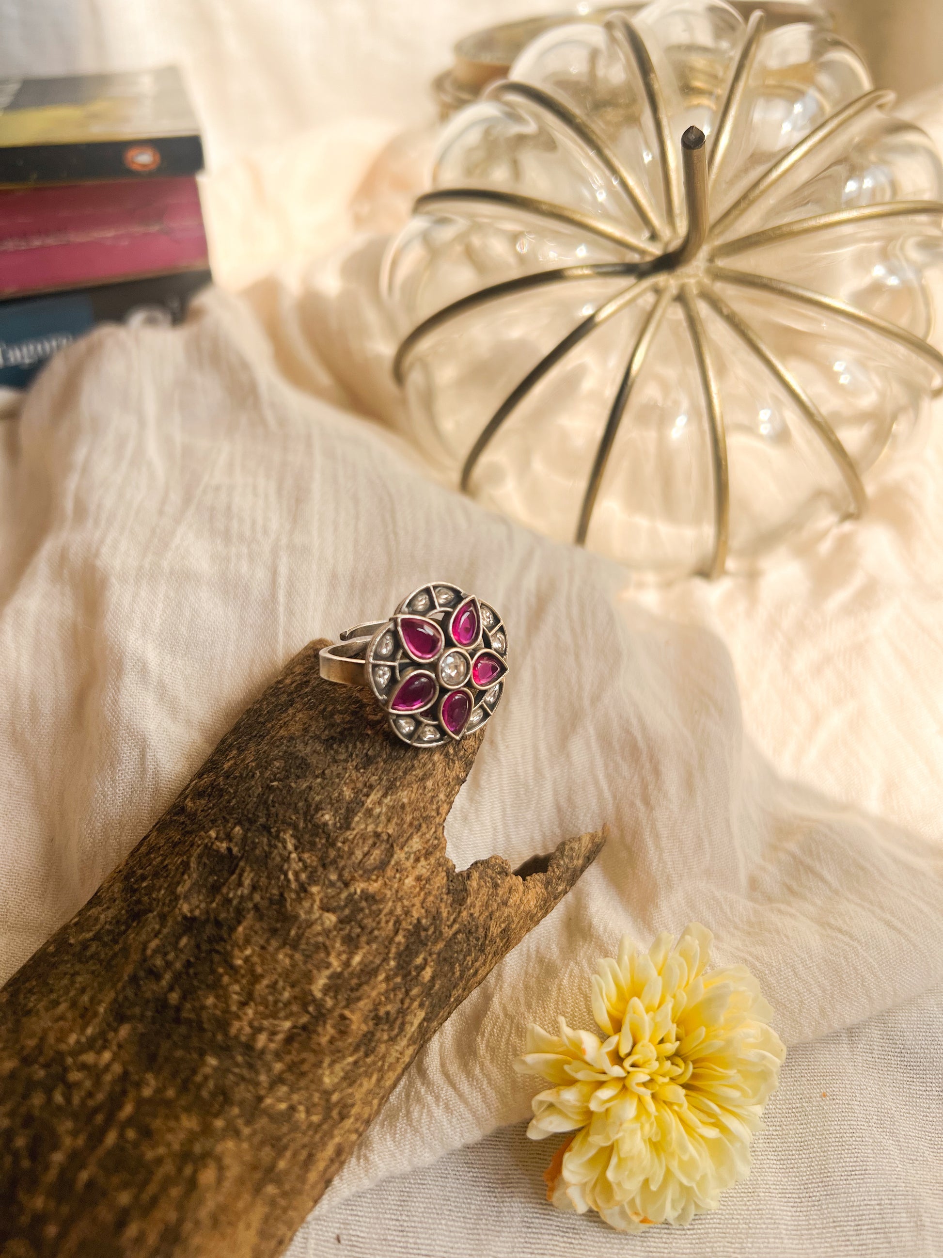 This adjustable ring features a captivating ruby onyx flower motif. The intricate design is further enhanced by a delicate white kundan surrounding, beautiful design makes it a symbol of timeless beauty and grace.