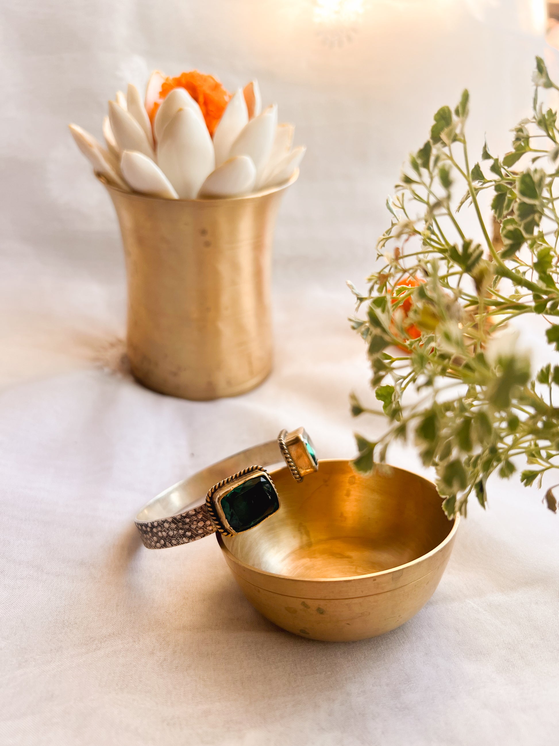 This exquisite accessory features a captivating big emerald onyx on both ends. Its adjustable design allows for a perfect fit, making it suitable for all wrist sizes.