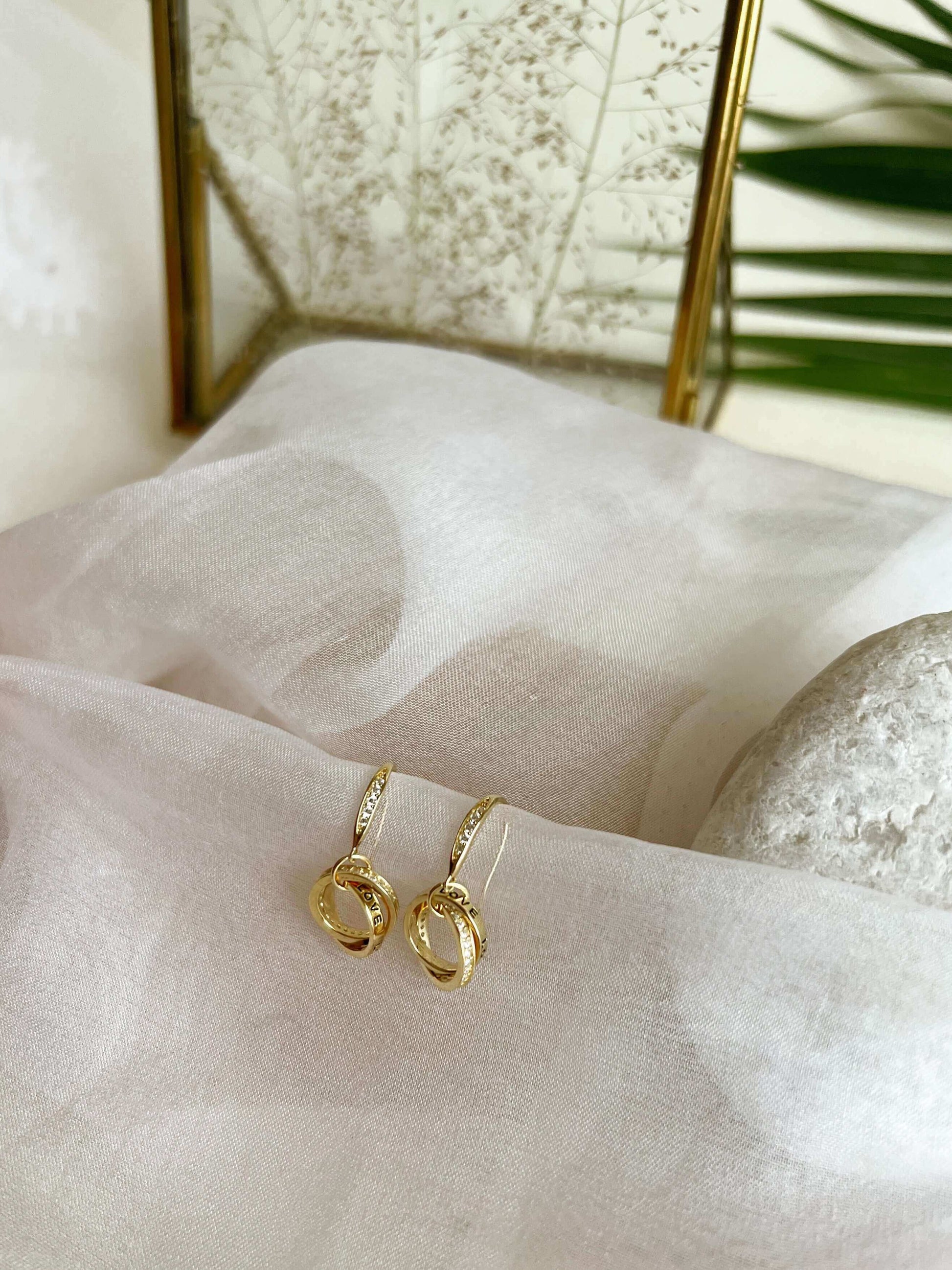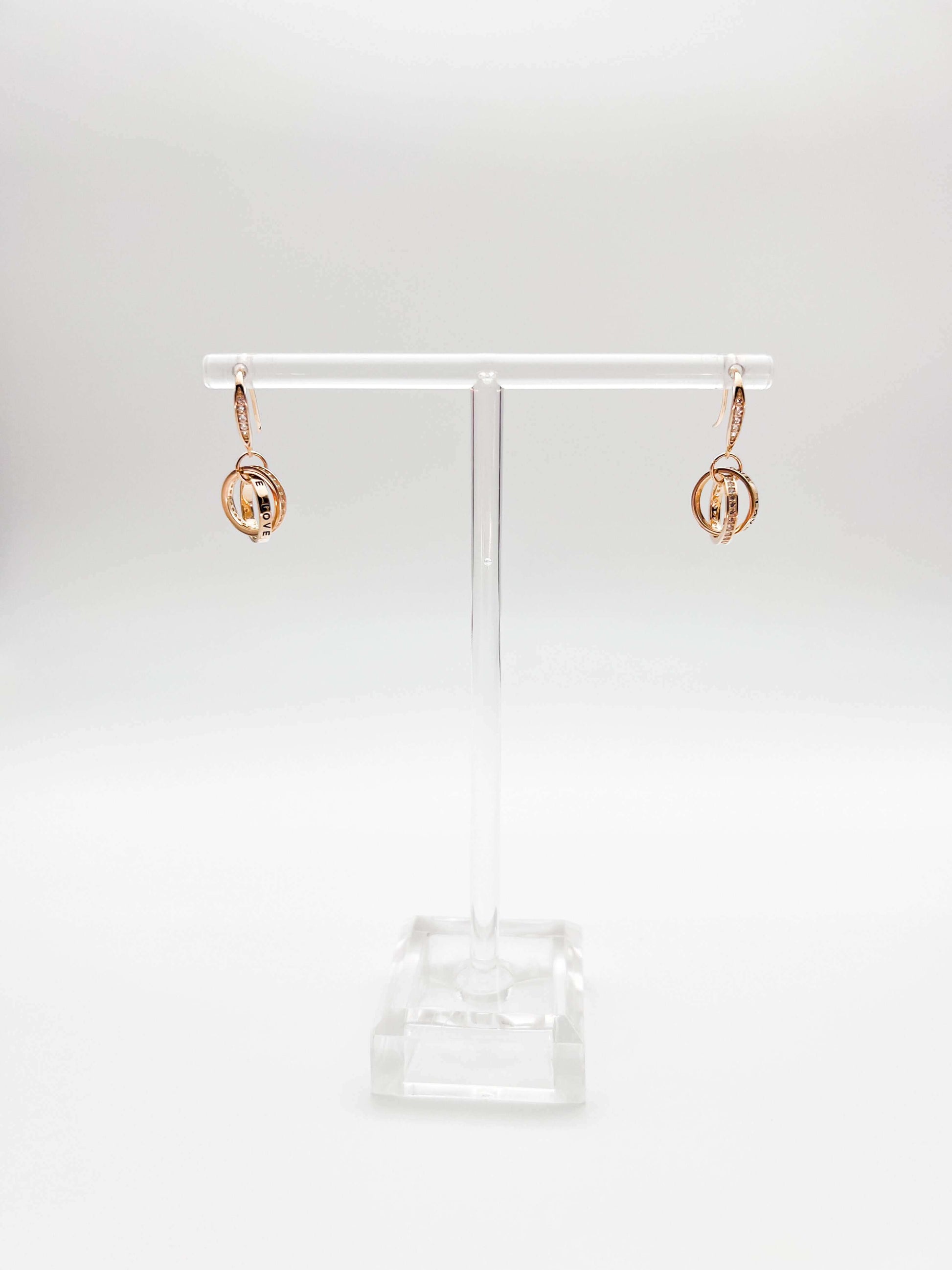 These beautiful fish hook danglers have intertwined circle charms hanging. Each circle charm is elegantly etched with the word "LOVE," making it a delightful and heartfelt symbol of love.