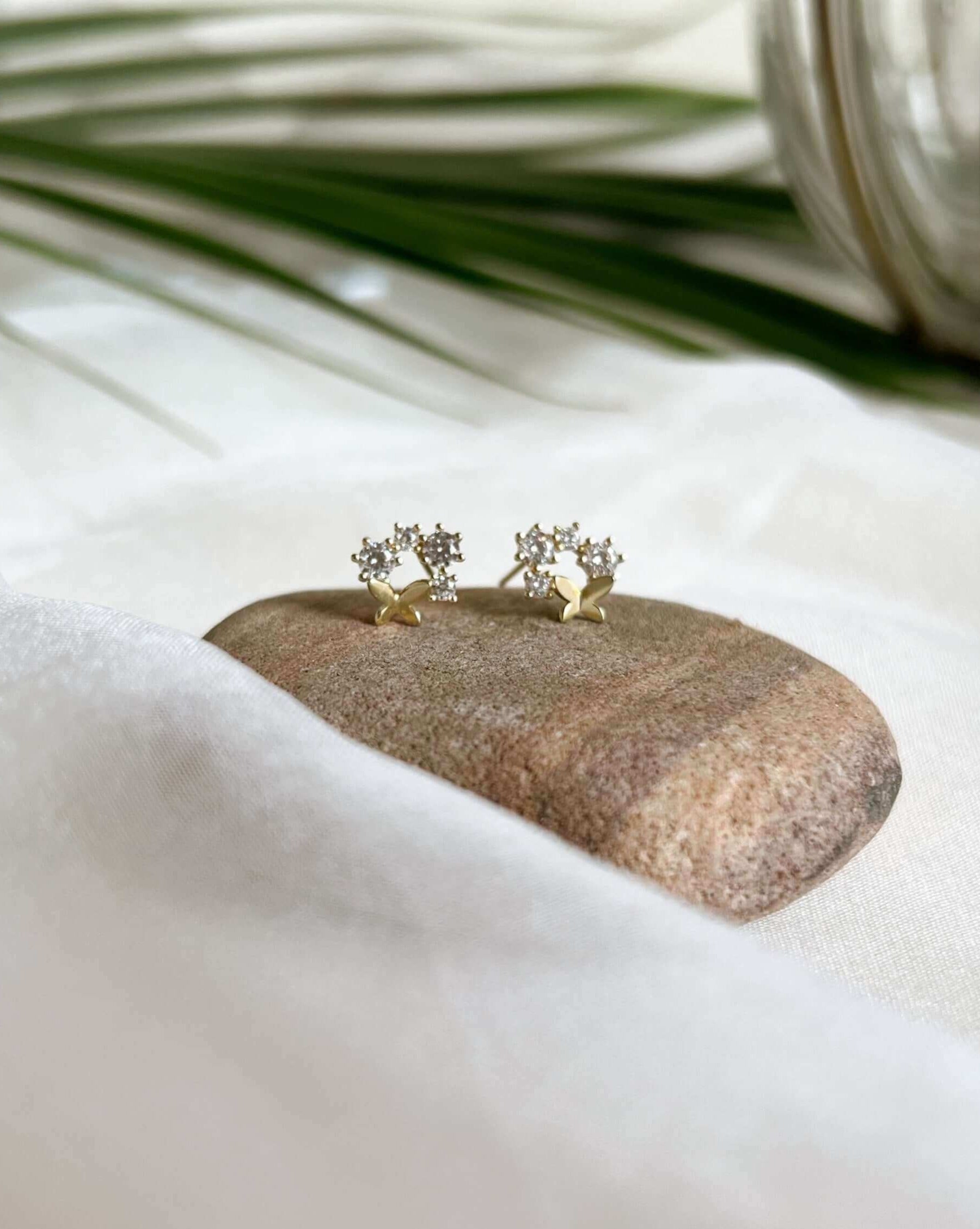 In these micro-studs with gold plating , small and intricate butterfly motif is crafted gracefully encircling the zircons, creating a whimsical earring. The delicate size and intricate craftsmanship make them ideal for everyday wear.
