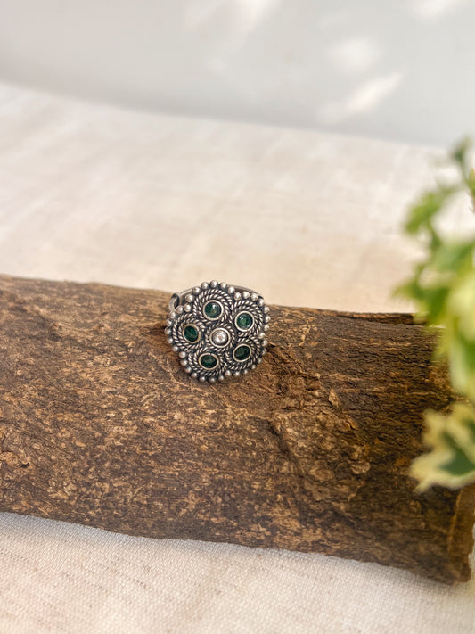 Zoya flower ring in oxidised silver with green stone (adjustable)